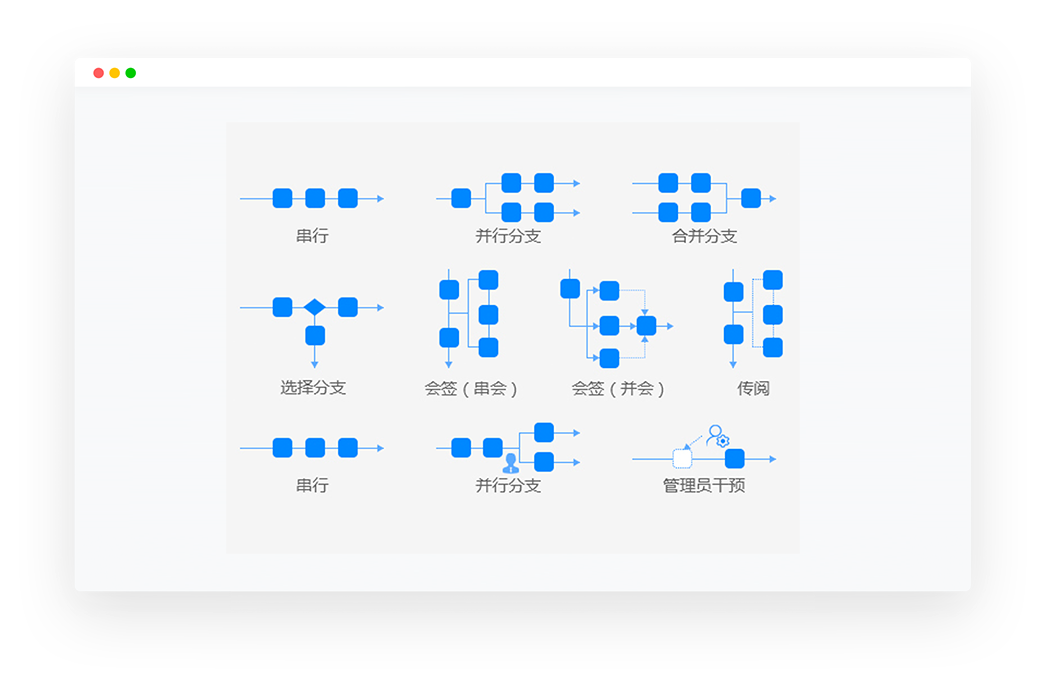 · 方便靈活,可視化、拖拽式設計 · 滿足串行、并行、合并、選擇、會(huì)簽、傳閱、跳轉、回退、幹預等各種(zhǒng)節點類型控制 · 快速适應業務需求變化、敏捷應對(duì)用戶需求調整